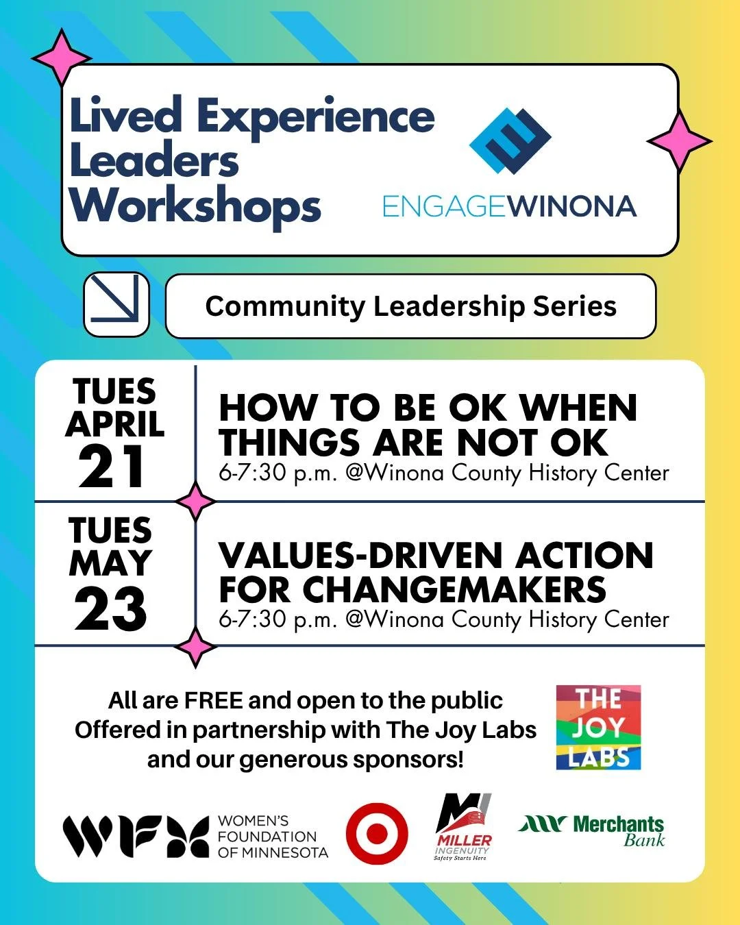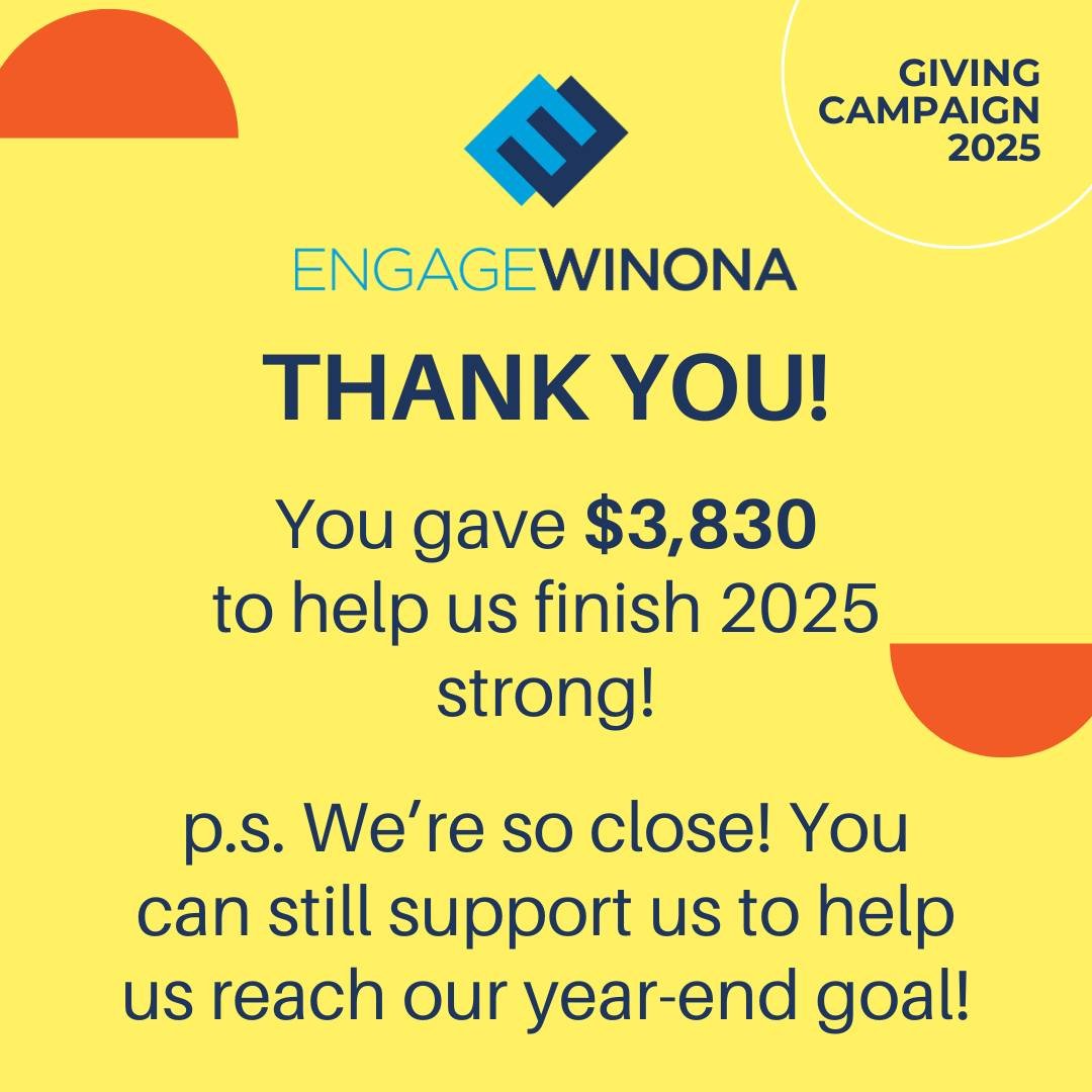 Engage Winona supports everyday people to take part in shaping their communities: to share ideas, build leadership skills, and participate. As people get involved and connected, whole communities thrive, becoming more able to collaborate, solve problems, and support themselves from the inside out.